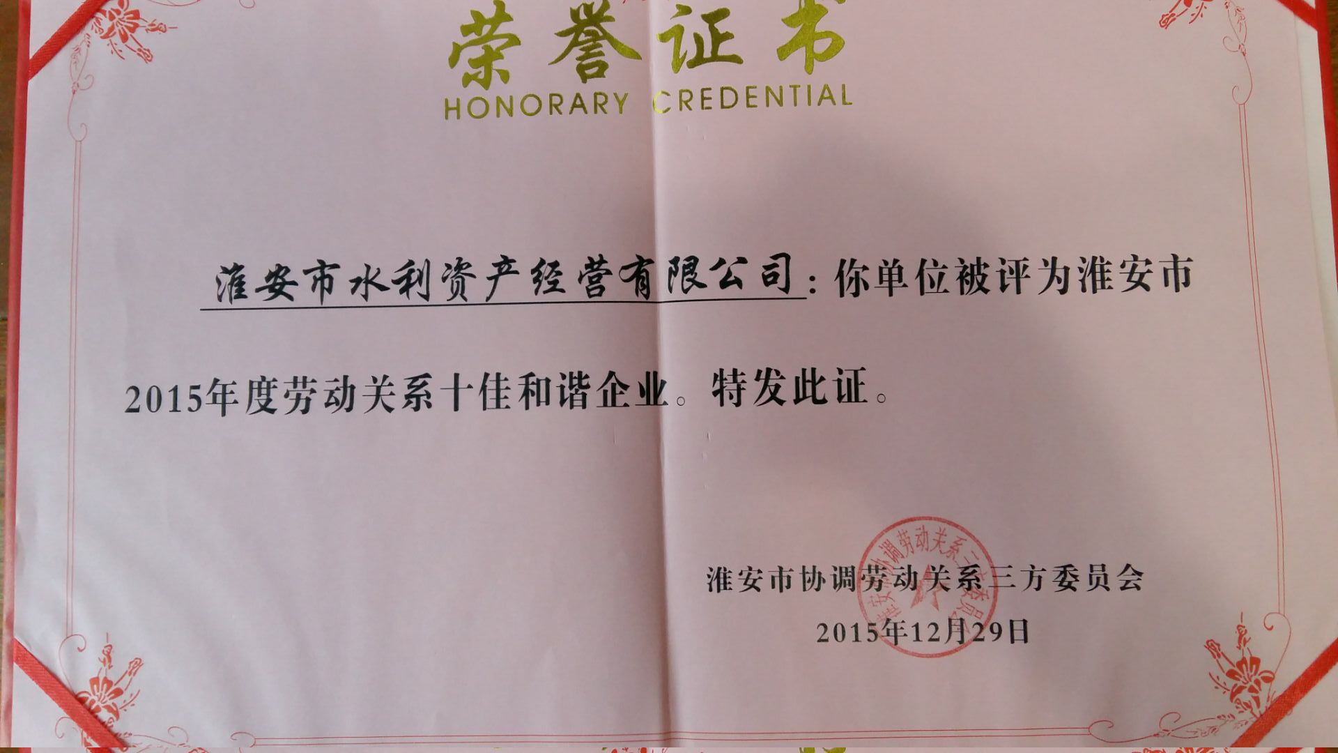 2015年度勞動關系十佳和諧企業